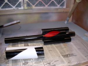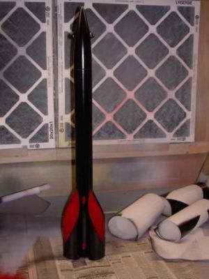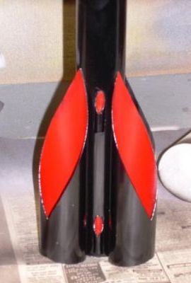 Pemberton Technologies Kraken I really liked the black and red paint on the illustration of the model and used the same pattern. I painted the inside of the tube fins and launch lugs red. If you are going to do this, I highly recommend making sure you have a heavy layer of paint in the upper parts of the fin. I used rolled up paper to mask the inside painted parts of the tube fins when I painted the remaining parts of the rocket. There was still a little overspray that got onto the red parts. With a thick layer, you can sand the over spray off and then clear coat the whole thing to get the gloss back. If you don't have a heavy enough coating to be able to sand off the overspray, you'll have to mask the inside of the fins when you paint the rocket or mask the rocket and repaint the inside of the fins later. Both methods will work, but I just don't like having to use masking tape if I don't have to.