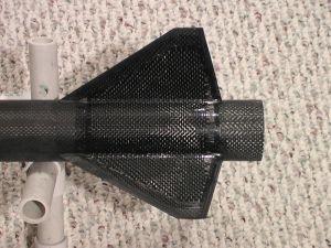 Needless to say, my initial reaction to the carbon fiber order was a big smile on my face! The 48” 54mm carbon fiber tube was awesome looking, extremely strong, and only weighed 14.0 ounces. The ends of the airframe were cut very square and required no modification. I cut the airframe into a 36” piece for the lower airframe, and 12” for the upper airframe. A Delta chop saw made quick work of cutting the airframe. I was a little surprised to see that the carbon seemed to easier on the chop saw that fiberglass tubing does! Don't get me wrong, PR fiberglass airframes cut great on a chop saw. The carbon is just that much better. Scuffing the carbon fiber airframe for surface mounted fins is straightforward with 60 or 80 grit sandpaper. The fins bonded easily to the airframe, and they are rocket solid with tip-to-tip standard weave 6.0 ounce carbon fiber cloth lamination.