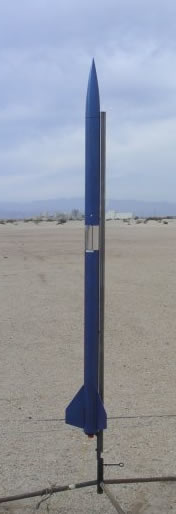 (I'll mention that on my second flight on a CTI J295 a couple of hours later, the rocket came in hard when the battery apparently came loose at motor ejection. Landing on the unforgiving desert floor, one fin was broken out of its slot but the rocket was otherwise undamaged, and the fin was easily fixed after I chiseled off the old fillets. Landing on grass, it probably would have survived without a scratch.)