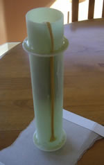 Now the injection. Using epoxy diluted with alcohol in a 10cc syringe, I injected epoxy through the hole on each side of each fin, two at a time, until that space was full (each fillet took about 7-8 cc.) You can see the shadow of the fillet if you hold the rocket up to a bright light. Make certain your holes are large enough to pass the tip of the syringe and clean your syringe with alcohol between sessions.