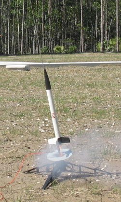 Firestorm Flight Rocket lifted off quickly from the pad and arced west. Parachute deployed and rocket touched down just a few yards away from the pad. - C6-5 - Durbin Crossing [More]