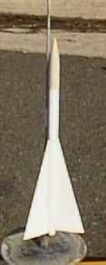 Well, I added weight to the nose cone to move the CG up and after a few days prepared for another flight. Prepped again with a B2-9 and off she went. Straight (with a little oscillation) up and up and up. With 2.8 seconds of burn time, this motor doesn't seem like it is going to stop. Excellent smoke trail, but wait . . . no ejection. Landing in tall grass, the rocket was recovered and will fly again.