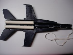 To begin construction, I glued the engine blocks inside the motor mount tubes using a spent engine casing and allowing 1/8" of the motor to stick out the back. After this dried, I took the bottom half of the plastic body and laid these two tubes inside of it where they pressed up against the plastic stop in the middle of the body. They hung out slightly from the two engine holes in the back. I aligned these until I thought they were in the straightest and best looking place and then used 15 minute epoxy to hold them in that place. I did this by just pouring the epoxy around the motor tubes at both ends. I allowed some of the epoxy to flow down inside the forward ends of the tubes to better hold them in place. Just be sure to have room in the tubes for the ejection charges to escape. I then cut an Estes style shock cord mount out of a piece of paper and used epoxy to attach this just aft of the forward landing gear well. The small gap between this landing gear area and the inner wall was a great place for the shock cord to come through and it gave it added strength.