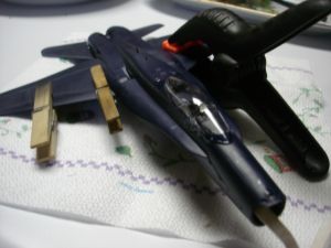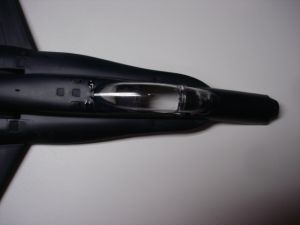 While this was setting up on the lower half, I next worked on the upper half of the body. The only really work that had to be done was the placement of the cockpit windows so the ejection charges could not leak out through the hole in the upper body section. First, the small U-shaped plastic piece was epoxied in place around the area where the cockpit chair would have been placed. Next, the two clear windows were epoxied on over this and epoxy was placed between them to be sure to seal all gaps.