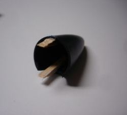 The trickiest part was getting the nose cone to work. I wanted to use the one that came in the plastic kit but it has no shoulder. I decided to make one using two small pieces of balsa wood. I epoxied them to the inside of the nose cone with half of each piece sticking out. Once it dried, I shaved off pieces of each one until it finally fit snuggly on the top of the rocket. I then used another Estes style shock cord mount to attach the other end of the shock cord, and tied a streamer to the cord near the nose cone.