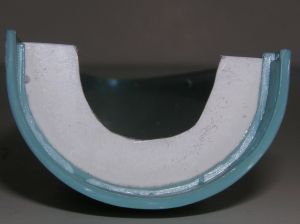Final assembly can now be started. First cut a small slit into the cap and feed the shock cord through until about ½" is left outside. Fold this over onto the coupler and epoxy it to the coupler. This will secure the cord to the nose cone. Glue the second stage booster and glider section together using the third stage to keep them flat with each other. Do not glue the third stage to the other stages yet! Once set up, remove the third stage pieces and glue the coupler into the second stage so it is up against the bottom of the glider section. Use glue only on the inside of the second stage to hold the coupler in and make sure the shock cord "bump" is facing out. Add the third stage flat piece to this next and add any additional fillets as needed now. Keep the third stage half round piece loose for the time being. When dry, attach the other end of the shock cord to the Kevlar® and test fit the whole assembly together. The coupler piece should be a snug fit but loose enough to eject. Adjust as necessary.