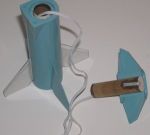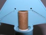 Take a used 18mm motor and wrap some ¼" masking tape around the nozzle end just as if you were going to use it for flight. Test fit the motor block slightly into the BT-20 tube and if OK, pull it out and add some wood glue to the inside of the BT-20 about 1.5" in. Insert the motor block and using the old motor as a spacer and push the block into the tube in one continuous motion till the tape stops it. Pull the motor out right away and let the glue set up. Don't stop or do this slowly or the motor block will "grab" and not be far enough in to take the motor. Once this has set up, measure down from the top of the tube to the motor block and transfer this measurement to the outside. Make a very small hole at the mark, which should now be just above the motor block inside. Use some thin CA to harden a very short part of the Kevlar® (1/8" or less) and insert it into the hole from the outside. Feed it through and out the top of the body tube. Take that end and make a small loop in the Kevlar® for the later addition of the elastic shock cord. Pull the Kevlar® back inside of the tube till the loop is just inside the tube. Take a small piece of masking tape to tape the Kevlar® to the outside of the body tube at the other end. Make this a flat as you can. Use some thin CA to hold all of this in place. When dry, cut off any excess Kevlar® and set it aside.