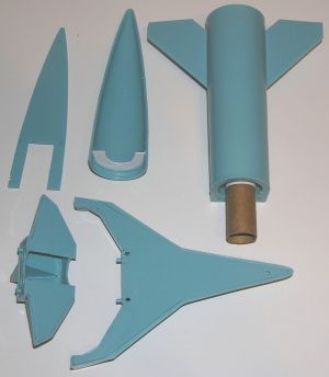The kit itself is a very basic build with several sections that would come apart on the display model but will be glued together to fly. The lower booster section is an excellent piece for the addition of a 18mm body tube/motor mount with the upper stages fastened together to form the nose cone. This would allow for plenty of power for flight with a small, fairly heavy rocket. For this conversion, you will need the following: