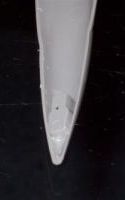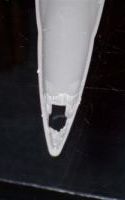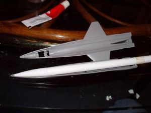 The first thing I did was use a Dremel to grind out the wheel well in the bottom half of the X-15. This makes room for the nose cone. After removing the wheel well, I epoxied the nose cone/body tube in the lower shell. There were some gaps along the body tube side where the plastic wasn't touching. To reinforce this area, I cut some strips from the frame which holds the plastic parts for the model. I wedged them along the side of the tube and used airplane glue to weld them to the shell. Then I painted epoxy over that and along the tube where the strips touched. I assembled the rest of the plane per instructions only leaving out parts which would not fit. In this case, it was only the little man inside the canopy. There were two versions to build. I chose the one without the wheels. The smaller lower fins needed to be reinforced. I used some flat strips of styrene scrap from the kit and welded it in with airplane glue, following with epoxy. Then I wrapped m asking tape along the point where I needed to cut the nose off and used an extra fine razor saw to remove the piece just above the nose cone. I made a tiny tri-fold shock cord and glued it in the tube. I recommend doing this beforehand as it was a pain to get in. I also packed some clay in and around the nosecone. I wasn't sure about gauging CP. I probably should have made a cardboard cutout. I chose to place the CG about 1/4 inch forward of the leading wing edge.