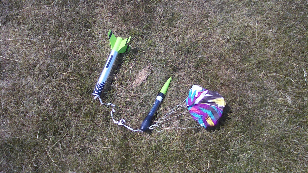 Launched with on board video camera.  Good flight, arced towards the east.  Parachute deployed and opened.  Daniel caught one-handed at 140 degrees, 40 yards from the launch site.  No damage.  Camera recorded entire flight.