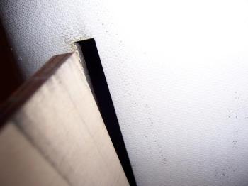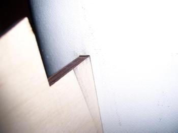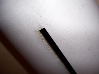 Looking toward a bright light from inside the nosecone, one can see where the seam passes more light. The photo below demonstrates that. The material seems heavy enough, but coarse on the inside. After working in the inside of the nose cone to epoxy in the bulk plate my arms were very itchy from contact with the rough glass fibers that are exposed. However, for the price of the kit this is a huge nosecone, standing 32-1/2 inches from the bottom of the shoulder to the tip of the nosecone. It is not coated with a glossy gel coat, but rather with a matte finish which actually will make it easier to prime and paint.