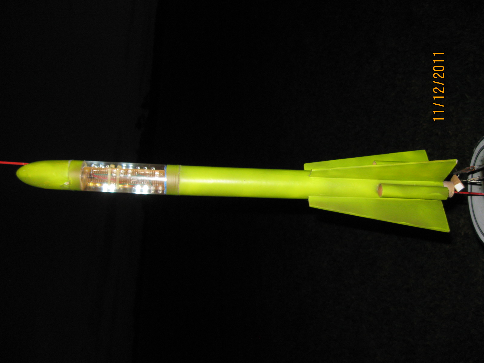 Rocket is a scratch buuilt with tubular fins and a clear payload section for LEDS and a battery.