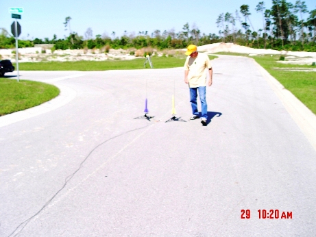 Trying for the two rockets one photo. An A engine is not big enough for this rocket. It hit the ground and busted a fin.