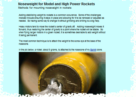 Doug Sams has written an excellent tutorial describing various methods of adding nose weight to rockets. Read the article on his web site at http://www.doug79.com/noseweight/.