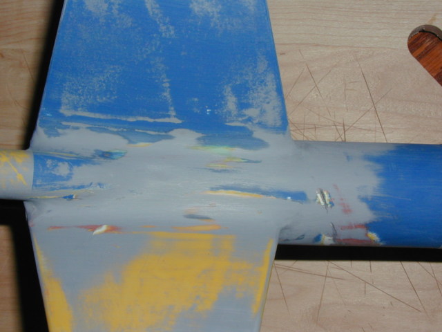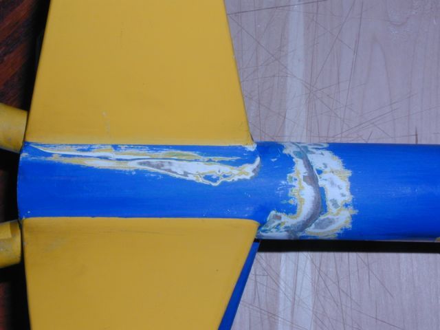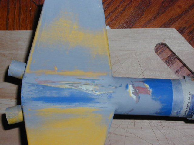 Bondo Glazing compound was added. I went ahead and fixed a couple of the fin wounds while I was at it. The glazing was sanded down to a minimum simply to allow the proper filling. I kept the sand to only the fin-can and blue area.