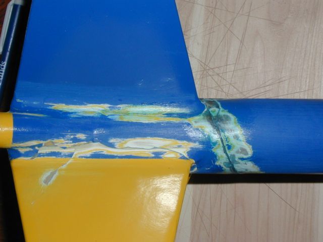Upon impact the DW#2 broke through at a stress point just above the fin-can. The rocket had already been repaired "above" this break, as there is a coupler that appeared to run to within inches of the top of the body tube. Also below this point is where the motor coupler was. A BT60 Coupler was glued in place and the tube was pushed back to where it met the fin-can. The loosened fin was lifted so that CA could be put under it and then clamped to dry in place. The tube joint was then soaked in CA to harden the paper tube. Everything was then ground with a Dremel and 100 Grit paper to take off the high edges. It was then re-CA soaked. A very thin epoxy coats was placed over the existing fin fillet to secure up that crack.