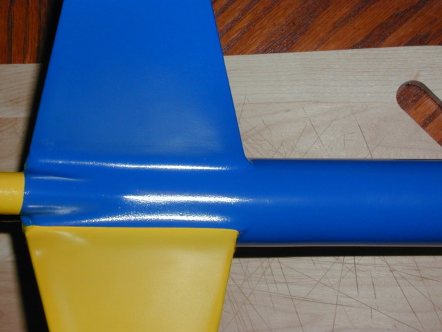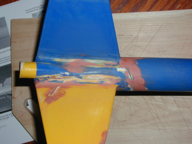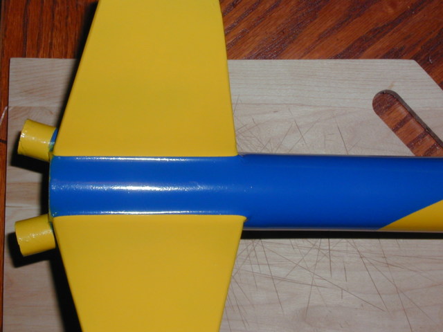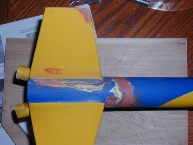 I then coated the fin-can and damaged area with Krylon White primer (it had looked like it was originally done this way and I didn't want grey primer to change the final color). I then target sprayed the yellow-fins. I also did a very light spray of the upper body/nose cone to "freshen it up". I masked off the yellow sections and sprayed the blue to finalize the repair. The rocket looks good.