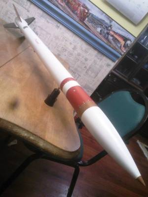 Nice single-staged one-fifth scale model of the Thiokol D-Region Tomahawk sounding rocket. KIt was made up of two long body tubes, a plastic nose cone with nice detailing, a plastic fin can, four plastic fins, a long stuffer motor mount tube, two plastic 5mm launch lugs, a twist-lock motor retainer, a plastic detail piece representing the prototype launch lug, a long rubber-band shock cord, a ...