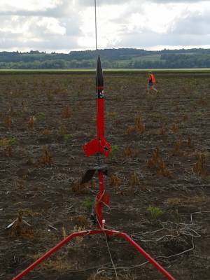 A stylish yet standard three fins and a nose cone rocket for 29mm and smaller motors. Heavy body tube and rakish plywood fins make for a tough and fun to fly rocket. The kit was neatly packaged in the standard clear plastic bag, with the motor tube floating around in the airframe tube, and a nylon chute, pre-cut plywood fins, rings, and launch lug inside a zip-lock bag. The fins are ...