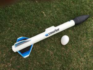 The Quest Courier kit is a single stage egg-lofter with the egg housing/nose cone as a slip together unit. Overall, a good looking and effective egg-lofting rocket. The kit comes with a 18mm motor mount assembly that's glued into a Quest-T-35 (1.378 diameter) tube, a set of pre-cut fins, and two 14" 'chutes. The 'chutes were pre-cut and very brightly colored. A piece of 18" Kevlar thread ...