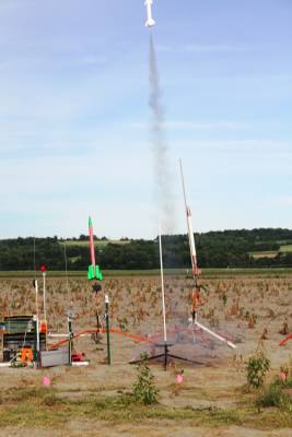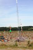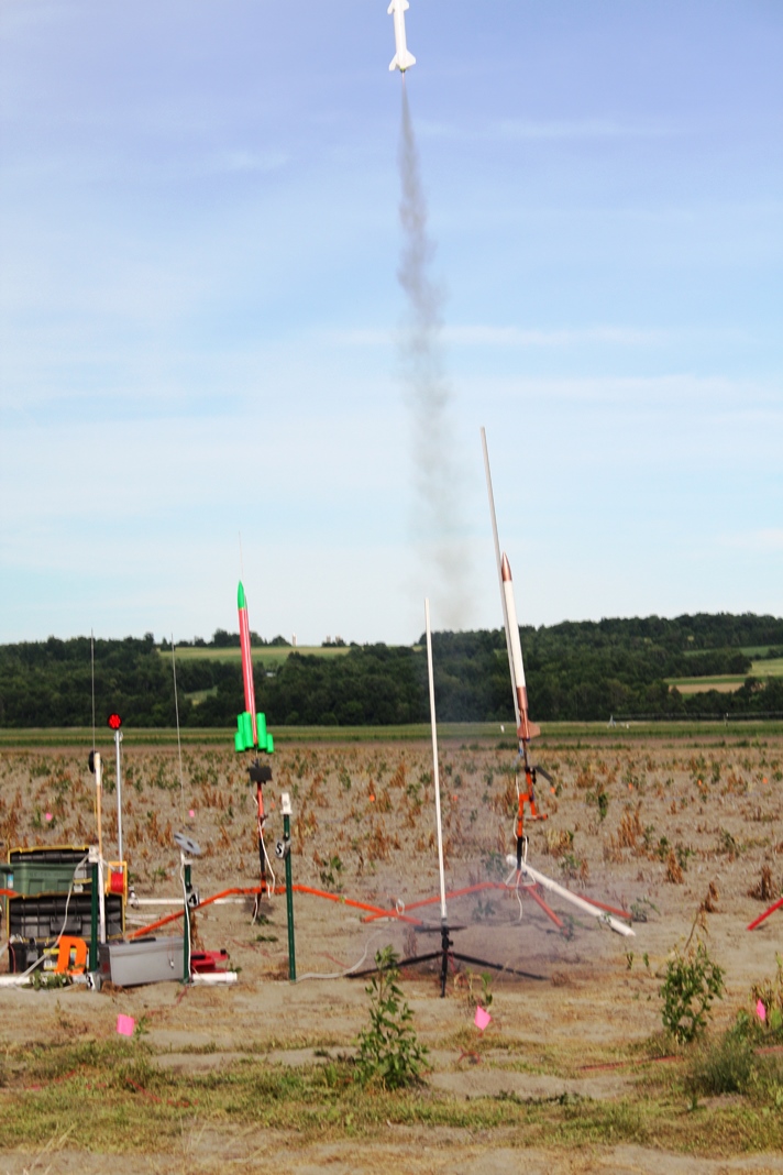 Prometheus is a military-style sport rocket designed with 29mm black powder or SU motors in mind. The tubes are 18" lengths, with a 2" long balsa transition, a BNC-60TB nose cone from ASP and a 2" long boat tail. It has a 6" payload section under the nose to allow for altimeters, etc. Both sets of fins overwrap the transitions, which makes for a pretty sleek appearance.