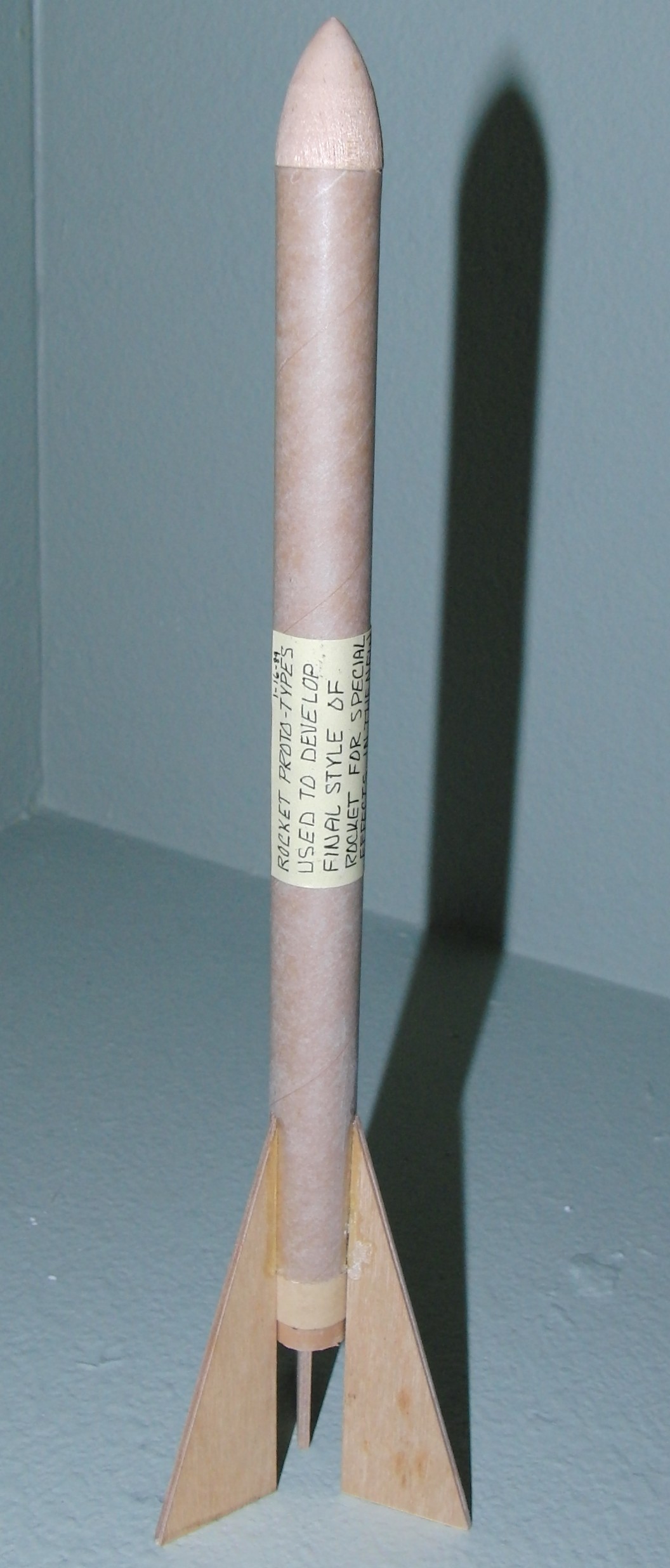 An episode of "The New Leave It To Beaver" portrayed children getting into trouble with fireworks. A model rocket with modified engines was used to simulate the fireworks. This is a prototype of the rocket.