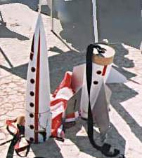 As an aside, I get tired of all the kits looking basically the same. The standard 3FNC (three fins and nose cone) look gets old pretty quickly. P.M.L. did a nice job of producing an interesting kit with appealing aesthetics. Now, we'll see if it can fly more than once! The kit is standard P.M.L. style, although the details are less well worked out than the Bull Dog was. (It's easy to tell this is a new kit.) The centering ring for the recovery tube had a very large center hole. I should have re-cut it, but I decided to use the one which came with the kit and fill up the gap with epoxy. The motor mount is built around the Qwik-Switch system and I built the rocket as described in the instruction. However, unless you actually plan to use 38mm motors in this rocket, I'd suggest using a slightly longer motor mount tube (an extra inch should do it) and skip the brittle plastic between the top of the motor mount tube and the centering ring. On February 13, 1999 at the February ROC launch in Lucerne Dry Lake, the Lunar Express flew for the first time. The boost was straight and sure, without any uncertainty or instability on a J180. I was sure that this kit was going to suffer major damage on landing. Those oversized fins with the silly pods on the tips are just fragile. However, only one fin pod broke off, and it can easily be re-attached. All in all, a successful flight! This time, the rocket didn't survive as well as on its first flight: separation! The tail section came down on the parachute with only two pods broken off, but the nose and body section came down without a parachute and the body tube pretty well smashed. Well, ultimately it was my own fault. I should have known not to use the P.M.L. elastic band, especially after I had this same failure on my P.M.L. Bull Dog. But, the P.M.L. elastic looks strong! Interestingly, on my Bull Dog the elastic broke where it was tied around a quick link, but on the Lunar Express it just broke in the middle.