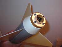 The 29mm motor was retained by Kaplow clips. Instead of the plywood centering ring (which is a 29 to 54mm adapter that slips inside the 54mm mother tube) I used a piece of 1/4" aluminum with tapped screw holes in place of T-nuts. Reported altitude was 950 ft.