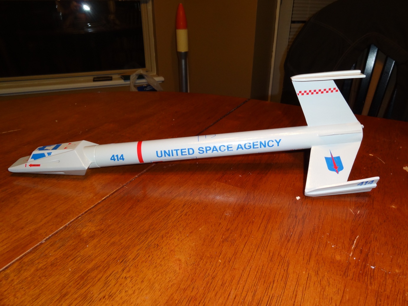 The usual suspects of thinned Elmers Fill & Finish, Valspar primer and copious sanding were the ingredients involved in getting the body tube prepped for painting.  Painting itself is a breeze as the Python Fighter is one of those rare birds that sports a single color paint job in the catalog photo.  I stuck with my tried and true Valspar paints and used Gloss Gull Grey.  I was a little concerned about the dull look to the finished bird, but the decals came to the rescue.  Decals were bought from Gordon at Excelsior, and supply all of the needed detail and color.  They were sprayed with three light coats of Testors Decal Bonder and probably applied better than the originals did.