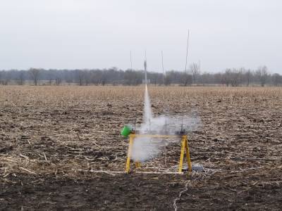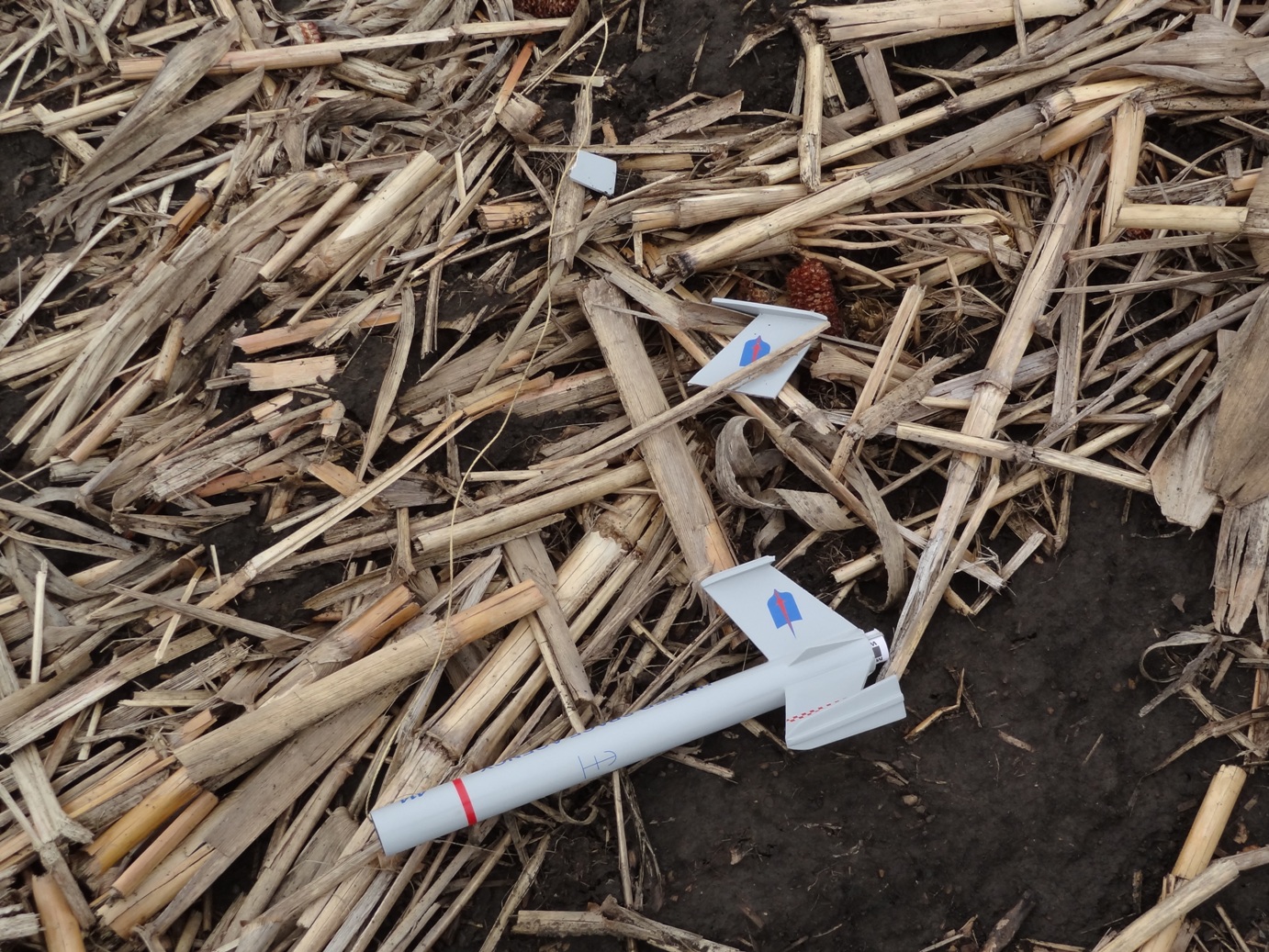 First flight was on a Quest C6-5 that I'd had rolling around my engine tote for a while.  The flight path was odd in that it corkscrewed with the wind instead of into it like every other rocket I flew on the day.  Ejection occurred late and the rocket began racing across the field with the wind, hitting hard and flipping through the air, but not enough to concern me.  When I reached the landing/crash site, I was surprised to find that I had lost one fin and part of another.  The one that had been ripped off lay in the corn, a clean break that should fix simply enough, but the other had the wingtip fin snapped in half, which was going to be a bit more difficult to fix properly.
