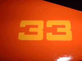 QModeling Rogue The kit I received came with waterslide decals, including one with a bright yellow "33" for two of the fins. Against the orange paint, the yellow decal was practically invisible. The instructions referenced a stencil which could be used to paint on the "33", but I didn't seem to get one. It turns out that the stencil was held up in development and when I inquired about it, I promptly received a couple of adhesive stencils fresh out of the test lab. These stencils are laser cut Avery adhesive labels. They are custom cut to fit the fin and the "33" is burned just enough to cut through the label without tearing through the backing. I could then stick the label to the fin, and pull away the "33" portion, exposing the area for painting. The result was a perfect, crisp masking job, and the best idea I've ever seen for a stencil!