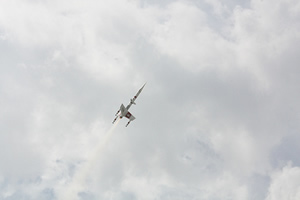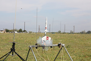 Flight 4 occurred on Jun. 13, 2009. With the (truly) final coat of paint, cardboard reinforcement of the buckled body tube (covered by the mirrored decal), and the full set of decals, the Vega was resplendent in her glory. I had reattached the parachute to the nose cone screw-eye, rather than onto the shock cord, halfway between the nose cone and the top of the body tube, as specified in the instructions. She was packing an E9-4 again. The Vega weathercocked, but achieved a safe altitude. She had her best recovery yet, landing on her spring-loaded feet, although falling over on her side immediately thereafter. There was no damage.