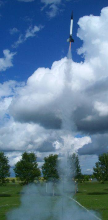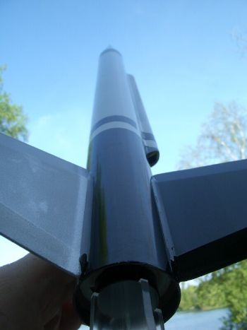 I re-attached the broken fin and applied an extra-generous epoxy fillet. A week later I was ready to attempt a second flight. The wind was much calmer, so I decided to shoot straight up and use the longer delay D12-5.