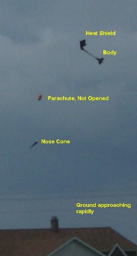 Takeoff was nice and straight, arcing over near apogee, then POP the recovery system spewed out. After several seconds of falling, still no chute. It landed hard, snapping off one of the silver fins. When I got to the crash site I found that the shroud lines were still tightly wrapped around the chute which never unfurled. I also discovered some scorch marks where hot gas had gotten around the Heat Shield. The scorches did not contribute to the hard landing, but they still concerned me.