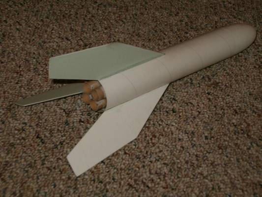 Based on the Baby Bertha design but with a slightly longer BT-60 tube by semroc I believe and modified for 4 13mm motors. Also features 3 fiberboard fins instead of 4 balsa ones for lighter weight as this rocket was built for competition in A - Clustered.