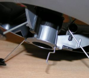 UFOAttaching the legs is done by sliding a plastic holder into a slot on the underside of the U.F.O.'s body. Not the easiest thing to do, and if not careful one could break the tab off of the black holder.