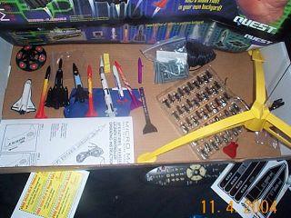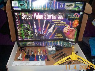 10 single stage RTF models. 50 MicroMaxx II-1 motors and QMX igniters with the thin, easy to heat wire). Full sized launch pad with Micro rod adapter and QMX igniter adapter. Regular 9V electronic Quest launch controller. 10 rockets, various designs, all streamer recovery (except saucer). Nothing to build. You do have to assemble the new igniter holder, but that is simple since it's 2 ...