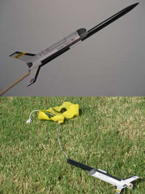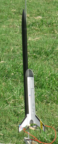 Thin Kevlar is tied to the engine block, followed by elastic and a short streamer. Topping it off is a Estes Quark style plastic nose cone, half filled with clay for stability.