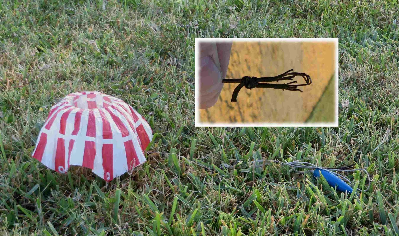 The 14" parachute was trimmed down to 12" and a large spill hole cut in the center.