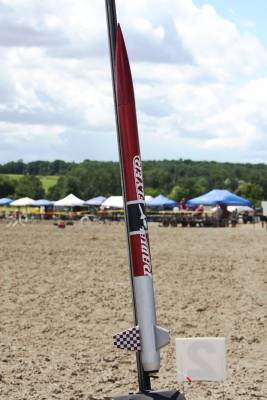 This was a special-order Radial Flyer in MAC Performance 54mm tube. The Radial Flyer is normally offered as a 3" or 4" kit, but I asked Mike for one using his 54mm tube. At the time of this writing, this is the only one in this size that exists. I added to that a 3D printed boat tail of my own design, lending the appearance of the Aero Pack boat tail motor retainer that the larger ones are designed for. This has a 29mm motor mount and a 36" parachute.