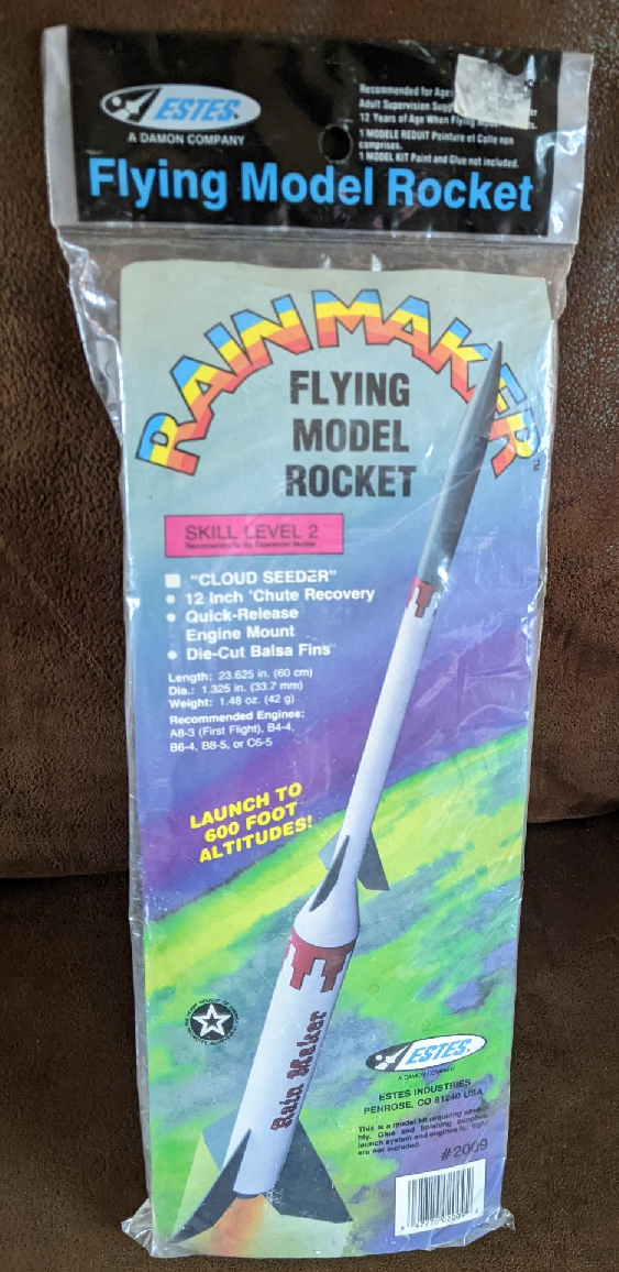 Brief: An OOP 2-foot tall rocket with a paper shroud transition and an unusual base. Recovers via a 12-inch parachute. I purchased it from the rocket model shop in one of its mystery box packages. The rocket came in a plastic bag with an art card. Construction: Kit consists of: 1 launch lug Estes paper shock cord mount 1 parachutes (Estes 12 inch) 1 2 foot ...