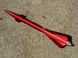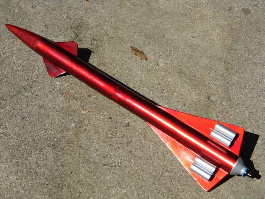 Rebuilt Ram Jam with a couple of changes. Now even shorter due to another crash landing (original mailing tube was 36". Tube is now only 26" long.) Extened MM and added boat tail to accomadate longer E & F motors. New paint on wing pods and a canopy decal on new NC. Also swapped out the big pink round nylon parachute I had in it originaly for a standard 24" yellow nylon one because of rocket being shorter and under 1lb. now, plus I kept haveing issues with the other 'chute not deploying properly (was to big for BT unless TIGHTLY packed, plus drifted to far on anything other than a calm day).