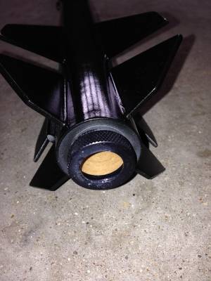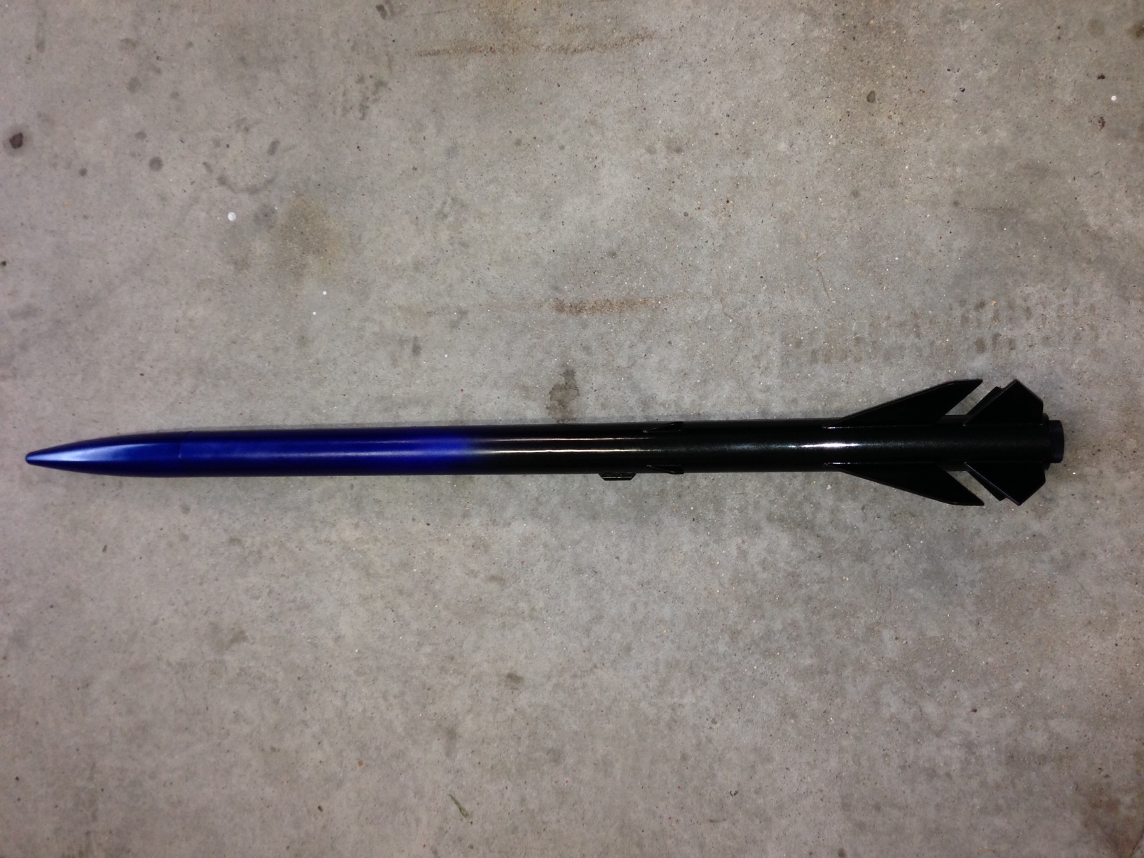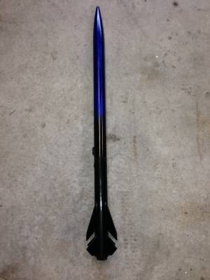This is a scratch built, scaled down version modeled after the Binder Design Raptor. The body diameter is standard BT-60 and the overall length is about 34". The nose cone is molded plastic and the fins are 3/32" balsa. It has an ejection baffle, screw on motor retainer and 18" nylon parachute. It flies on 24mm black powder motors. I decided to do a blue to black fade on the paint, hence the rockets name.