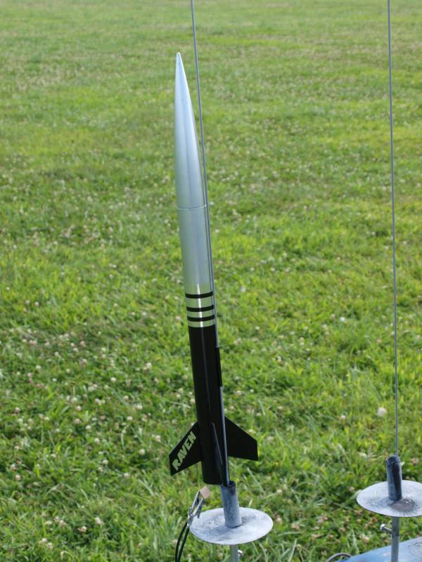 First flight for the Raven came at a Wright Stuff Rocketeers launch in Dayton, OH, in August of 2015. Powered by a C6-5, it was chased off the pad by Crazy Daisy to an altitude of 500'. Since the air was dead calm that day, the flight was straight and it recovered within 100' of the pad.