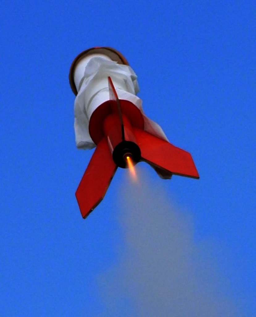 This was a disappointing flight. With a crowd watching and 3 full rolls the rocket made it about 20 feet off the pad and went horizontal toward the crowd - it was a heads up flight and no one was hit - Thankfully!