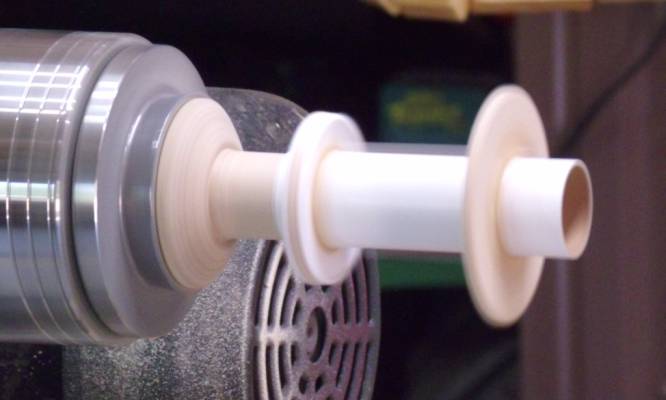 It is a rear eject spool design that utilizes laminated paper fins formed around a wooden buck.