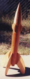 Single staged, 29mm motor rocket in all wood construction and retro looking design, much like the stout sci fi rocketships with huge swept back fins, seen in old movies.