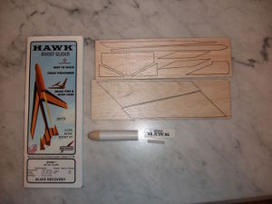 Brief: The Hawk is a boost glider that uses a rocket engine to get itself in the air. It is a "Retro-Repro" of an older rocket. Semroc is selling them for $7.50 right now so I decided to pick one up. Construction: When I bought the kit I figured there wouldn't be very many pieces. I got it and found only 5 parts in the whole kit. It comes with: 1 BT-20J ...