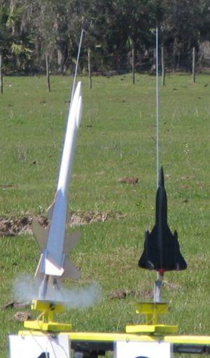 Since I was using an adapter to fly a C6-5 on the maiden flight, a stability test was certainly in order. "Paying it forward", I enlisted the assistance of a couple kids on the field that had never performed a swing test before. We cleared a 20' x 20' area and balanced the fully loaded rocket. Then each kid took a turn at spinning the rocket overhead until 10 or 12 feet of string had been let out. Even at very low speeds, the SU-47 was stable. The large wing area immediately forced the nose forward and the vertical fins held it there as speed built up. I suspect when loaded with a D12 motor, very little ballast will be necessary.