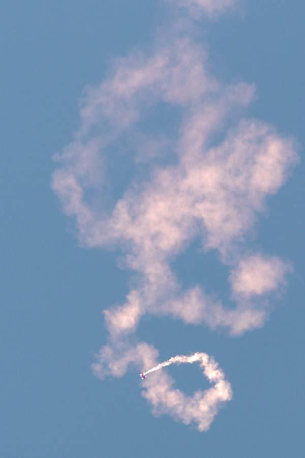 Mentioned above was the use of the "FireBall", which was attached to about 24ft of tubular nylon, then a 6' chute. Yep, main at Apogee, why you ask? I wanted a long lingering descent. Some time ago I found some orange "cold smoke" canisters, that are designed to be used as emergency beacons in the water. I got four of them (3 more ready to use!). I tied the can up in 1/8" Kevlar® thread and epoxied the knots to create a cage around the canister, then attached the pull string to the nose cone. At deployment the ring was pulled and orange smoke started to pour out. No one at the launch knew (I should have told the Launch Director and will next time), so after I confirmed that it was "by design" and that it was "cold smoke", everyone enjoyed (especially me) the skywriting that happened for over 5 mins. as the rocket lazily descended. The smoke stopped about 10 seconds after landing, and of course I knew exactly where it was!